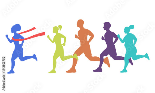 A marathon and a winner with a red ribbon. The winner becomes the leader. Silhouettes of different colors. Runners.
