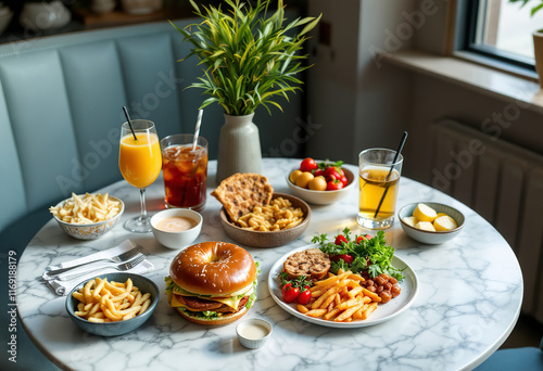 A marble table in a casual dining setting is adorned with a variety of food items and beverages