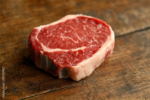 A marbled beef steak sits on a wooden surface, showcasing its rich red color and fat content, perfect for grilling or searing.