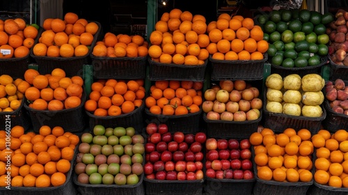 A market scene with baskets of ripe oranges, apples, and pears stacked neatly,