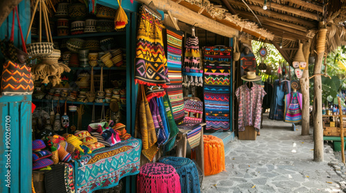A market stall displaying an array of colorful handicrafts and textiles, highlighting the vibrant culture and craftsmanship of the region.