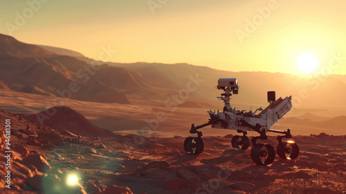 A Mars rover capturing a sunset, with the sun setting behind rugged hills, the landscape bathed in a warm, reddish light, and the sky showing faint blue tones