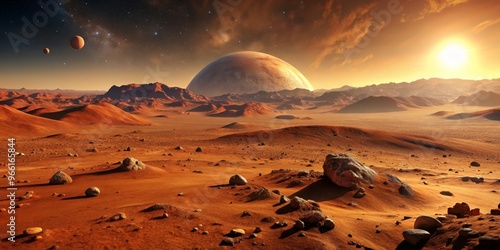A Martian Sunset with a Giant Gas Planet, Digital Painting, Red Landscape, Sun, Gas Giant, Mars, Space