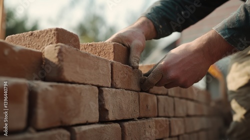 A mason carefully placing bricks to form a brick wall. Featuring detail and strength