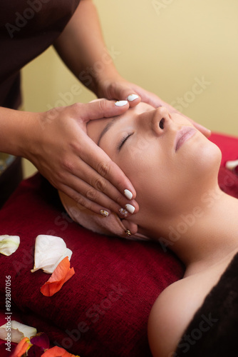 a masseuse in a cosmetology salon makes a Thai massage on the face of a young girl