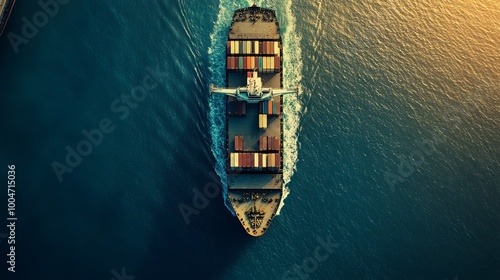 A massive container ship, a symbol of international trade, navigates the open ocean, carrying a vast cargo of goods. Its destination is a bustling shipping port, where cranes