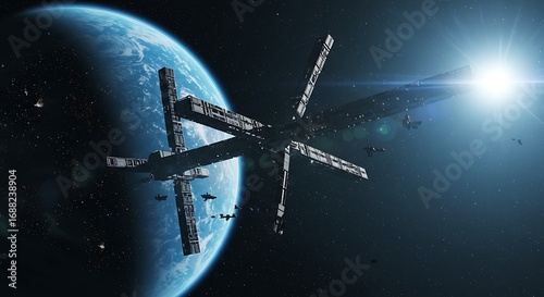 A massive futuristic space station orbits a blue planet, illuminated by a distant, bright star in the dark cosmos.