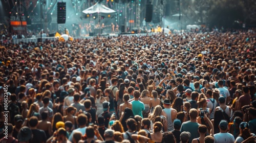 A massive gathering of individuals standing in anticipation in front of a raised platform or stage.