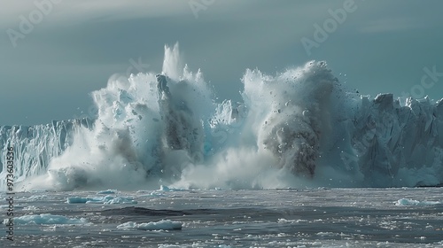 A massive iceberg calving from a glacier, with a colossal chunk of ice breaking away and crashing into the ocean, a dramatic visual of climate change in action. The event highlights the ongoing
