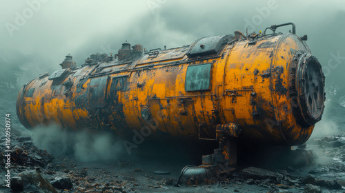 A massive rusty yellow tank in a foggy industrial landscape, highlighting decay and industrial history