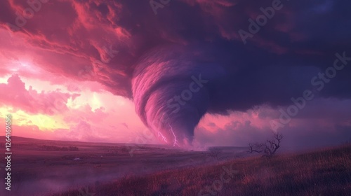 A massive wedge tornado tearing across the countryside, the surrounding supercell lit by pink and purple hues from the setting sun, an electrifying moment.