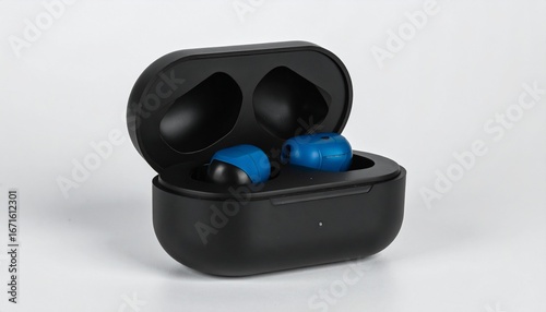 A matte black charging case holds two wireless earbuds with vibrant blue tips.