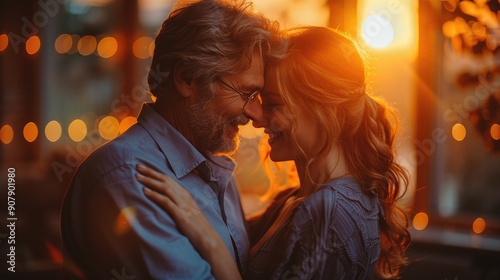 A mature couple shares an intimate moment during sunset, highlighting their love and affection in a warm, glowing setting.