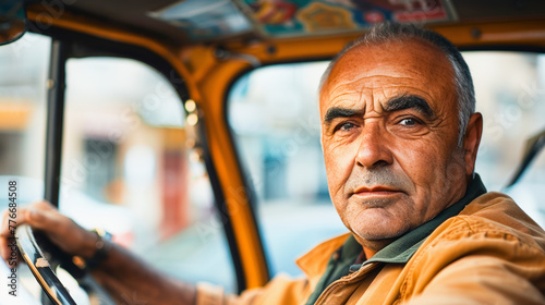 A mature male taxi driver confidently steering his vehicle, his experienced gaze reflecting years on the road.