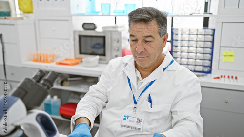 A mature man in a laboratory wearing a lab coat and gloves examining a sample with a microscope.