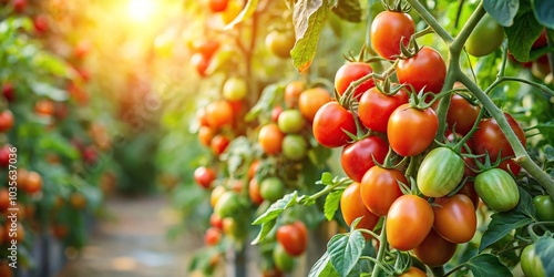 A mature tomato plant with sprawling vines and heavy fruit production in a warm sunny garden, outdoor, foliage