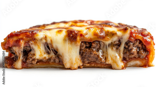 A meaty slice of lasagna topped with melted cheese is isolated against a white background