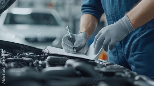 A mechanic is writing on a clipboard while working on a car