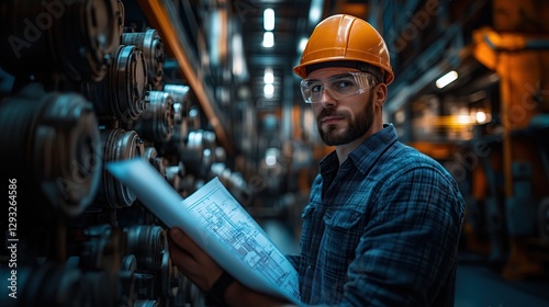 A mechanical/electrical engineer examining technical blueprints, wearing a safety helmet, industrial background