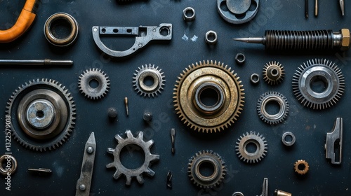 A mechanic's workbench with a disassembled gearbox and gears, tools arranged for an organized gear system repair process.