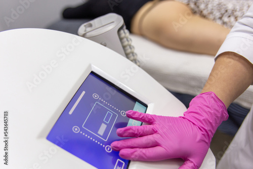 A medic adjusts the operating mode of the anti-cellulite massage machine with compression and vibration technology in beautician office.