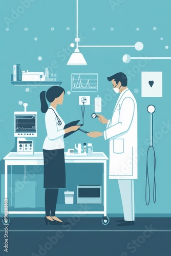 A medical scene showing a doctor and a nurse discussing patient care in a clinical setting.