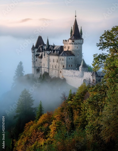 A medieval castle surrounded by dense fog and trees, evoking mystery and adventure