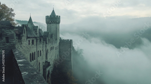 A medieval fortress overlooking a misty valley, with stone battlements and a watchtower reaching into the clouds.