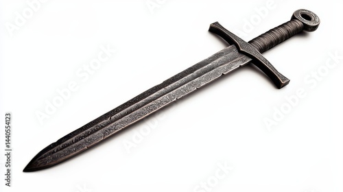A medieval-style sword with an ornate blade and crossguard, lying on a white background.