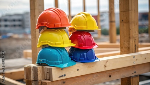 A medium closeup of hard hats in vibrant colors stacked beside a newly erected wooden frame representing teamwork and the collective effort that shapes the landscape over time.