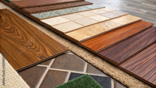 A medium closeup of various flooring samples laid out on the ground where rich wood grains vibrant carpet fibers and glossy tile surfaces reflect diverse styles and textures being