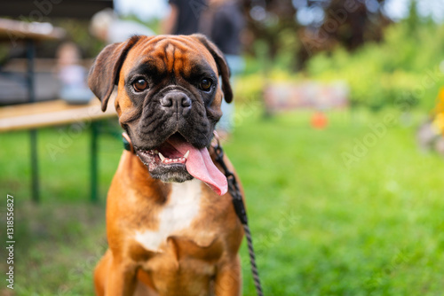 A medium-sized sturdy male purebred, fawn coloured, Boxer. Young Boxer Dog sitting in a garden. A young boxer takes a break and relaxes in a garden. A fawn coloured, purebred Boxer.