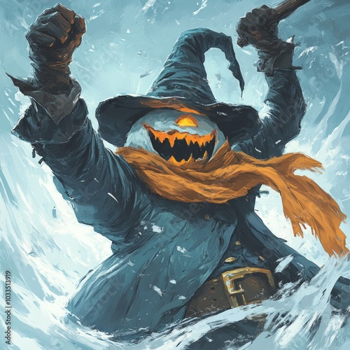 A menacing snowman with a pumpkin head, wielding a stick in a snowy landscape.