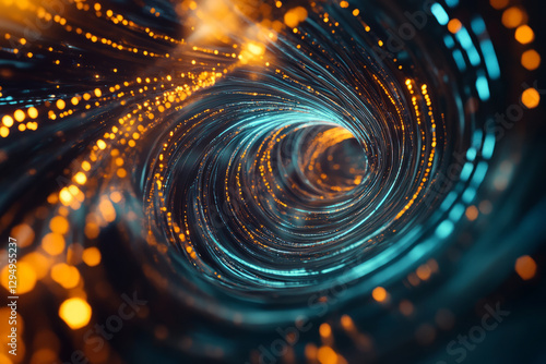 A mesmerizing 3D abstract background featuring a swirling vortex of iridescent, glowing lines forming an intricate fractal pattern. The luminous strands pulse with a cybernetic glow, creating a