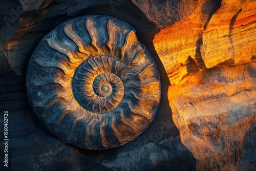 A mesmerizing ammonite fossil embedded in ancient, sunlit rock, showcasing intricate spiral patterns and rich textures.