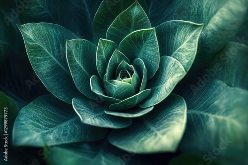 A mesmerizing close-up of a succulent's intricate, teal leaves forming a rosette pattern.