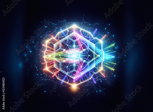 A mesmerizing double exposure image showcases a vibrant, geometric structure radiating energy. Intricate lines and glowing colors create a sense of depth and movement within a dark background.