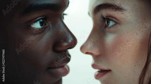 A mesmerizing focus on the eyes of two individuals, showcasing deep contrasts in skin tones and a moment rich with unspoken emotion and connection. The proximity emphasizes their bond