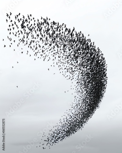 A mesmerizing formation of birds in flight against a cloudy sky, showcasing the beauty and harmony of nature.