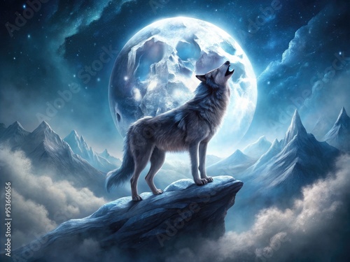 A mesmerizing hand-drawn illustration of a majestic wolf standing on a moonlit mountain, its haunting howl echoing through the night, surrounded by swirling mist.