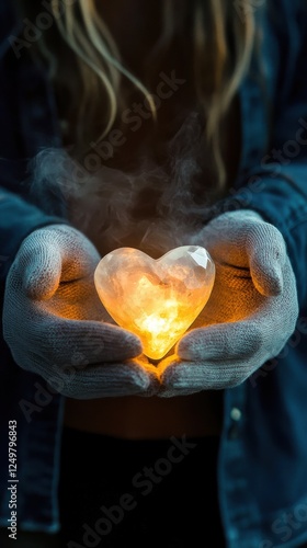 A mesmerizing image of hands cradling a glowing heart-shaped crystal, symbolizing love, warmth, and the ethereal beauty of emotions captured in art.