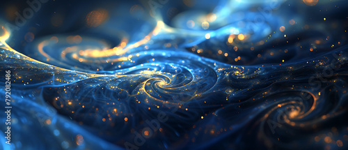 a mesmerizing interplay of swirling blue and golden lines. The dark blue lines create fluid, wave-like patterns