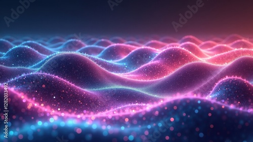 A mesmerizing landscape of neon-lit fractal geometries folding into higher dimensions, vibrant pulses of light shifting across a quantum field in constant motion.