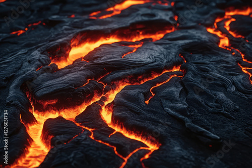 A mesmerizing lava flow background with deep crimson and molten orange hues, where fiery rivers of magma carve glowing paths through the dark, cracked terrain.