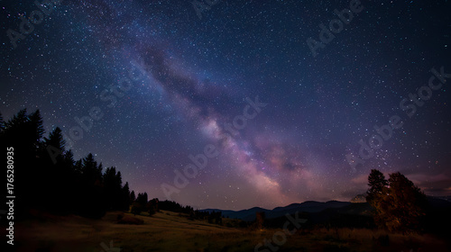 A mesmerizing night sky showcases the Milky Way, casting a soft glow over a serene landscape