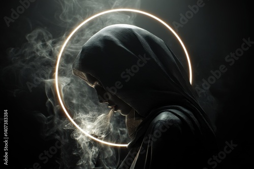A mesmerizing profile of a cloaked figure, enveloped by a luminous halo and ethereal smoke, creating an atmosphere of mystery and intrigue in deep shadow.