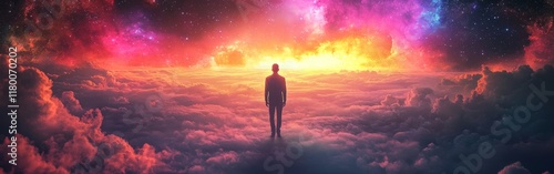 A mesmerizing scene of a person walking toward a vibrant galaxy surrounded by mystical clouds and twinkling stars. Ideal for fantasy, exploration, and cosmic-themed projects
