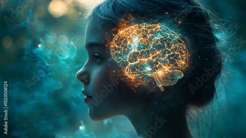 A mesmerizing silhouette of a child's head showcasing a glowing brain, ideal for Mental Health Day campaigns, educational materials, or children's creativity promotions.