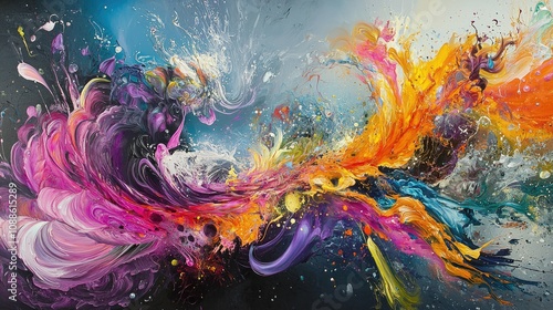 A mesmerizing splash of vibrant liquid art, with swirling colors and intricate details of viscosity and texture, creating a dramatic, high-energy visual effect