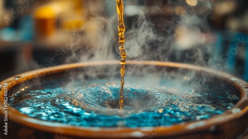 A mesmerizing stream of golden liquid cascades into a vibrant blue pool. The steam rises, captivating the senses and igniting curiosity. Generative AI